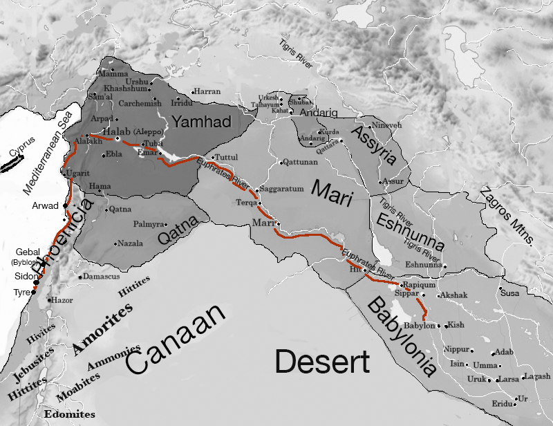This week I’ve continued to work on the third book of the Ancient Elements series, The Phoenician Coin, as the main character, Sam, nears his goal of finding his uncle in Tyre. Sam’s father, Dagon, also takes further steps toward his goal of seeking revenge on Sam and Sam’s uncle (Dagon’s brother) for the misfortunes Dagon believes they have caused him. As I completed a chapter that saw Dagon and his Babylonian caravan travel west and then south from the area now known as northern Syria, drawing closer to his destination of Tyre, I included the caravan’s course on this map, as seen below.